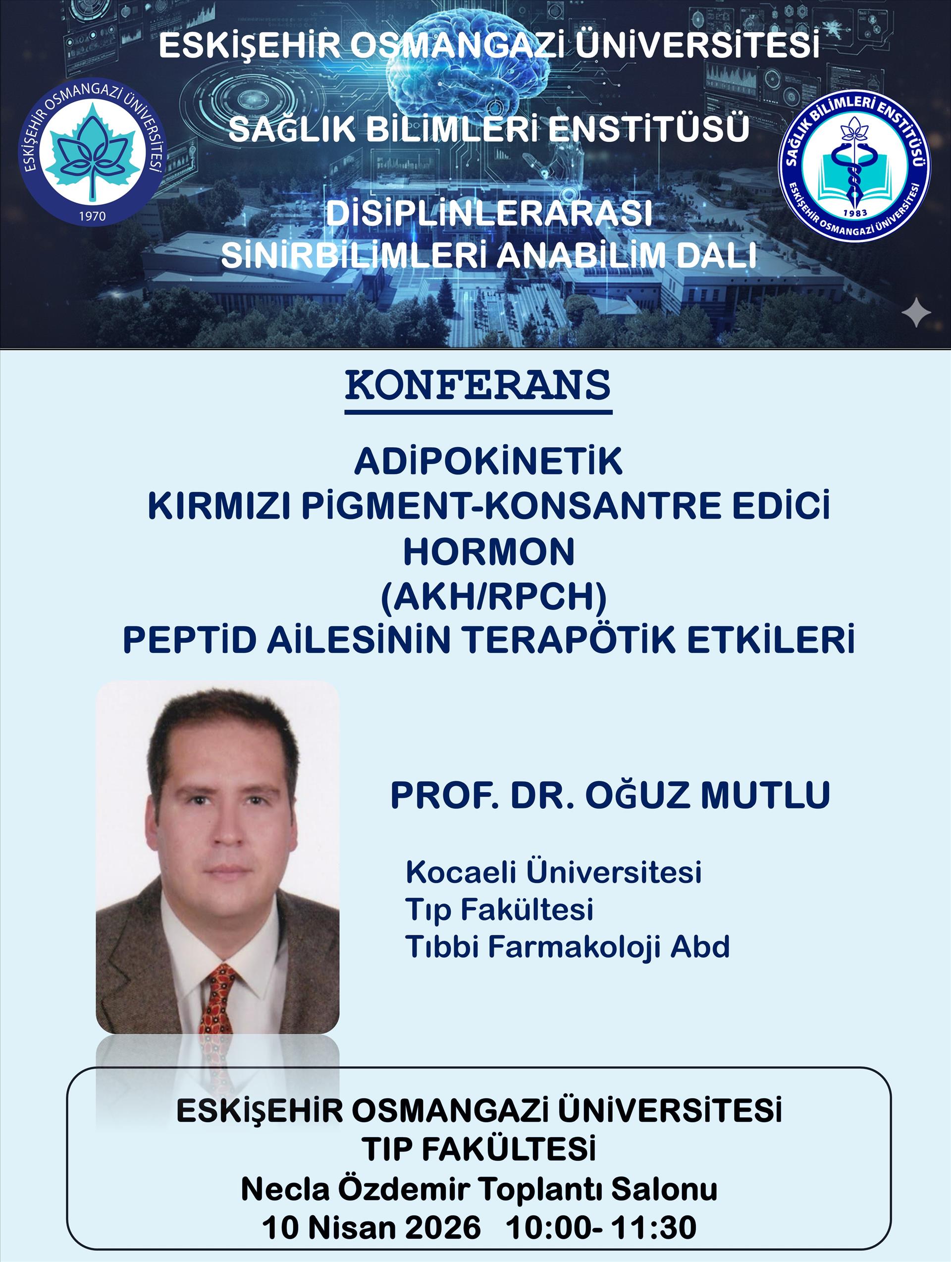 10 Nisan 2026 tarihinde "ADİPOKİNETİK KIRMIZI PİGMENT-KONSANTRE EDİCİ HORMON (AKH/RPCH) PEPTİD AİLESİNİN TERAPÖTİK ETKİLERİ" başlıklı konferansımız ESOGÜ Tıp Fakültesi Necla Özdemir Toplantı Salonunda gerçekleştirilecektir.